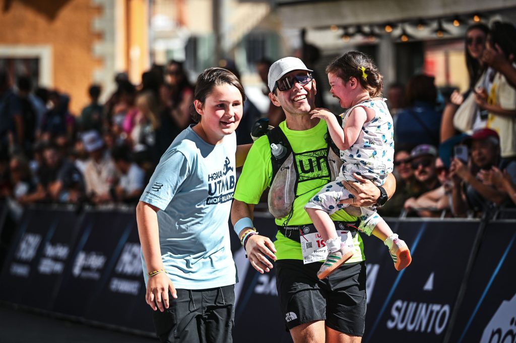 Stephen at finish line, 2025 Ultra Trail du Mont Blanc (UTMB), in Chamonix, France, with son Henry and daughter Olive.